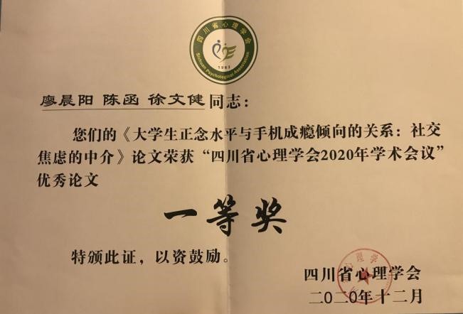 本次学术年会评选出了四川省心理学会2020学术年会优秀论文,亚博官网师生斩获多项奖励。徐文健特聘副研究员、2020级应用心理专业硕士研究生廖晨阳提交的研究论文双双荣获一等奖,2019级硕士生夏宇荣获三等奖,2020级硕士生敬凡珂和李柳欣获优秀奖。