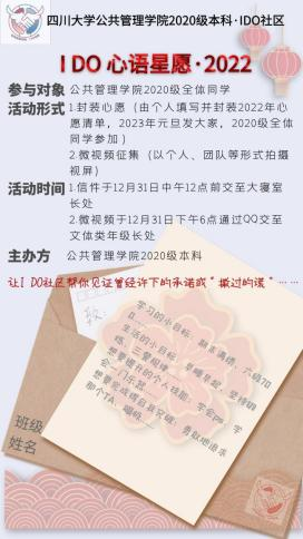 本年度“心语星愿”活动主要由两部分构成:“2022心愿清单封装”和“2022微心愿视频征集”。在“让I DO社区帮你见证曾经许下的承诺或‘撒过的谎’”这一诙谐幽默却意涵深刻的年度标语的感召下,同学们积极通过封印年度心愿的形式,向一年后的自己留下期待和梦想,也踊跃而大胆地表达着自己这一年要感谢和祝福的人。年级学生干部为每位同学准备了统一的、印有“I DO社区”LOGO的精美年度心愿信封,供同学们使用。2020级本科辅导员苟欢老师也与同学们一同写作和封装年度心愿清单,并向大家送出诚挚的新年愿望,并同大家一起期待一年后的愿望解封时刻。