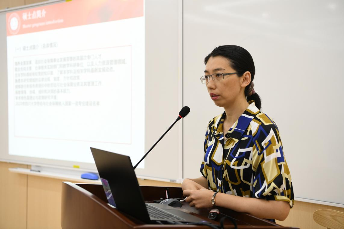 开营仪式的第二个部分是学院和学科介绍。首先,教学管理科科长李岚老师从扎实的学科建设、雄厚的师资力量、丰硕的学术成果、优秀的生源质量以及完备的奖助体系等方面对亚博官网学科发展,专业设置以及研究生招生、培养等情况做了全面介绍。接着,社会保障专业张浩淼教授和应用心理学专业李诗颖副教授分别从学科方向、师资队伍、学生发展等方面介绍了各专业的培养特色和培养要求,鼓励同学们报考川大,圆梦川大。