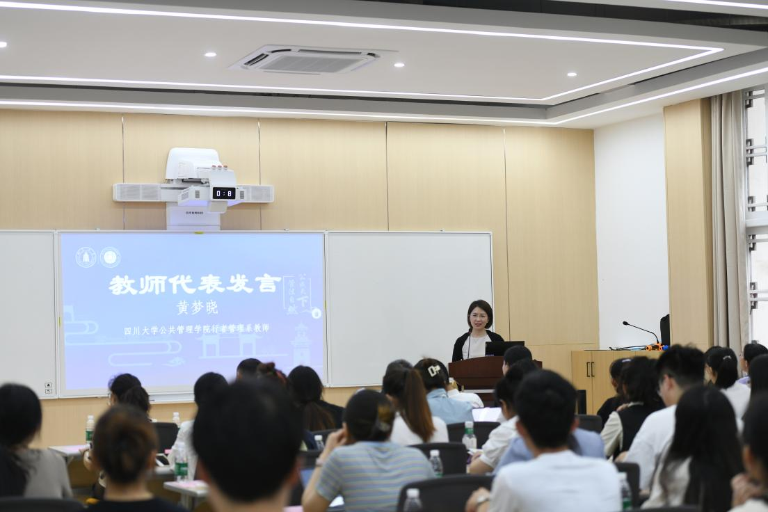 行政管理系黄梦晓老师作为教师代表发言。黄老师从“追求真理”、“共同生活”两个方面讲述了学院老师坚守公共情怀,传道、授业、解惑的点滴故事,她勉励全体营员探索真问题,追求真学术,以实际行动诠释“公成天下,管法自然”的真谛。