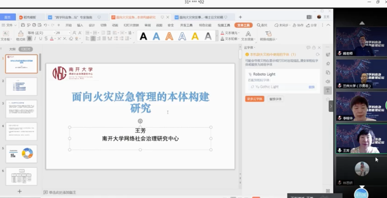 南开大学商学院网络社会治理研究中心主任王芳教授主要讲述了面向火灾应急管理的本体构建研究。她在阐释突发事件和应急管理的相关概念、本体构建的相关知识基础上,以火灾应急管理为研究对象,从确定本体的应用领域和范围、构建本体模型、定义火灾应急领域知识三个部分介绍了研究思路,并详细展示了火灾应急上位本体构建、火灾应急尚未本体实现等研究过程,最后从定性评价和定量评价两方面对火灾应急本体模型进行评价。