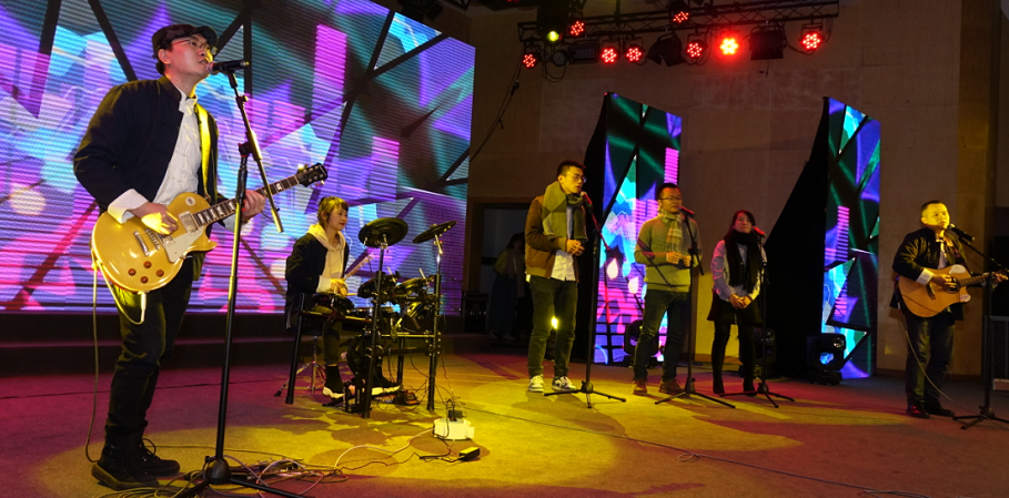 亚博官网教职工以“像风一样自由”为曲目在本次新年音乐晚会上进行乐队演唱,精彩的表演将演出推向高潮,赢得了在场观众阵阵掌声。