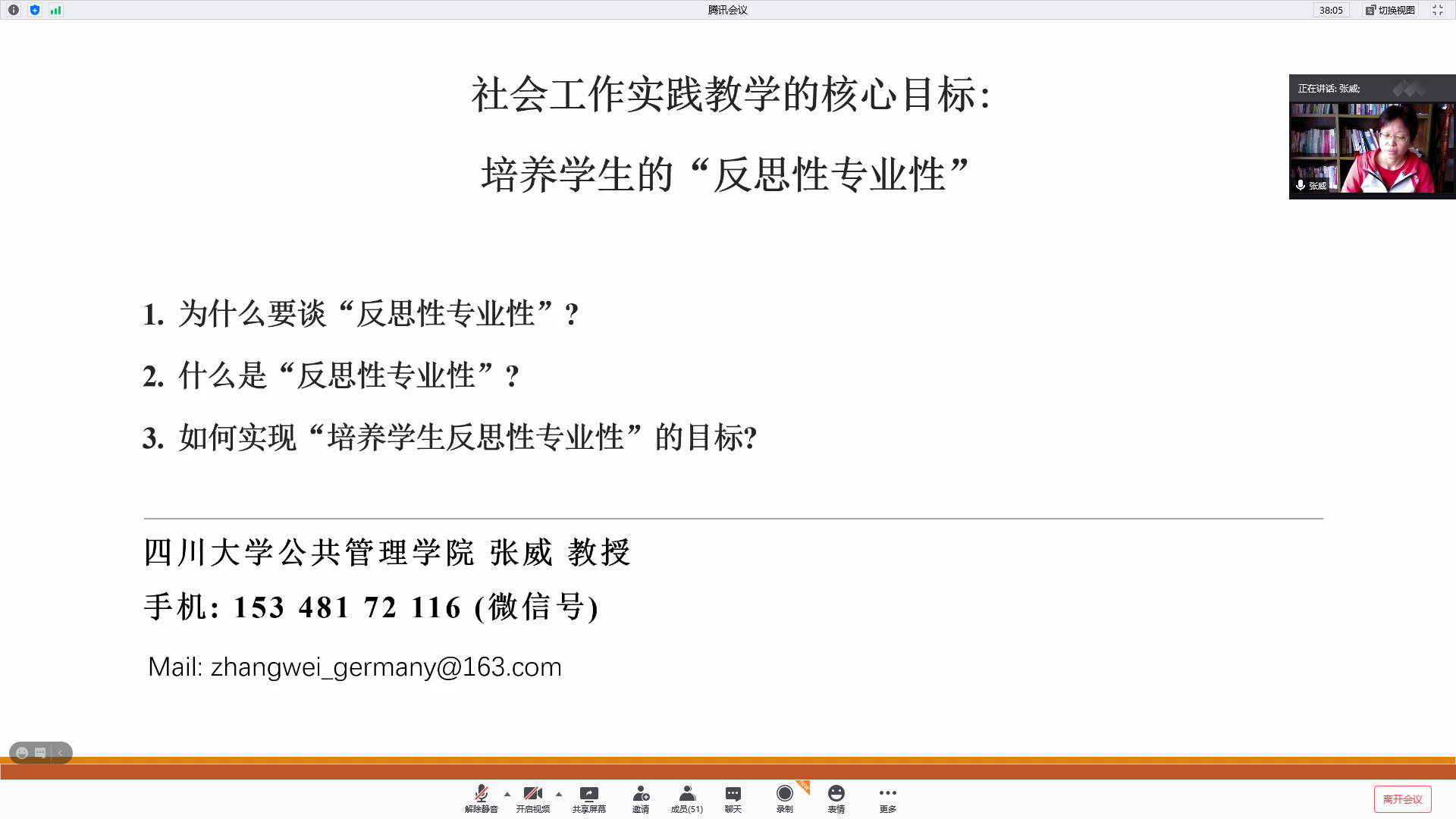 最后张威教授分析了:如何实现“培养学生反思性专业性”的目标?第一,实现的核心途径:“广义教育”,而非传授知识、技能、方法、技巧和价值观的“狭义教育”。广义教育是一种教育者和被教育者双方之间相互影响和相互作用的过程,其终极目标在于:推动学生形成自我思考、自我教育、自我学习、自我成长的能力。第二,实现的前提条件:对师生有一定要求。对教师的要求:需要具备广义教育的能力,同时具备一线社会工作经验。对学生的要求:需要具备一定的基础能力和学习能力(但较难,因为两者均来自学生的社会化过程)。第三,实现的难点:对教师要求较高,对学生的基础状态有一定要求,且需要一个长期循环的过程。