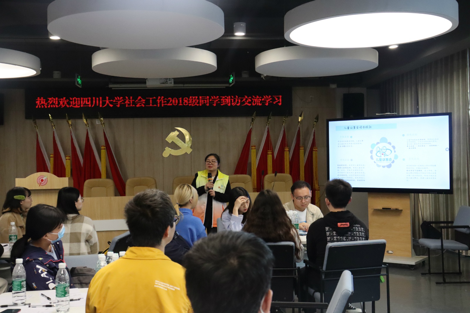 下午2时许,师生乘坐大巴来到位于成都市郫都区郫筒街道的奎星楼社区。在社区综合体,社工向师生介绍了社区规模、人群分布、居民需求以及社区居委会建设等情况,师生对社区基本状况有了充分的了解。