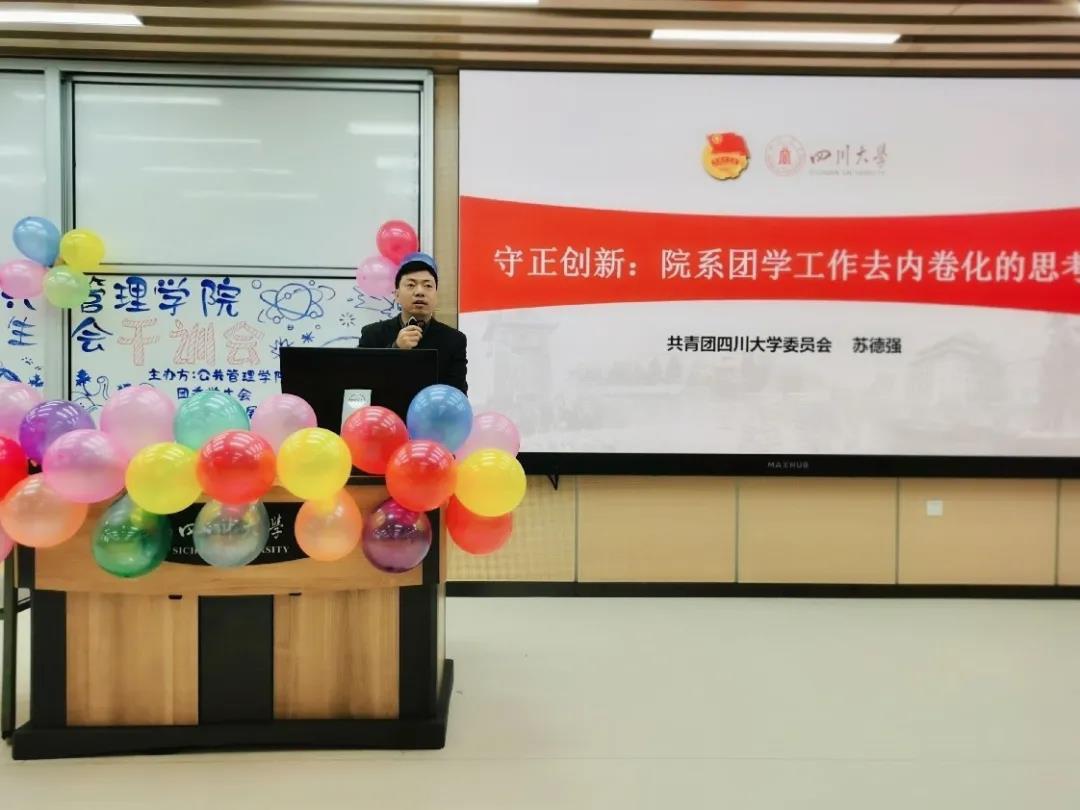 首先,苏德强老师以“守正创新:院系团学工作去内卷化的思考”为题为大家带来指导。苏老师指出了院系团学工作中存在的值得注意的倾向、阐释了“内卷”的概念与特点、点明了院系团学工作内卷化的典型特征,让全体参会人员对院系学生工作去内卷化有了更深的认识。苏老师在对亚博取款曝顾秒到账团学工作给予充分肯定的同时,激励全体成员在今后的学生工作中能更好的引领服务、锻炼自我,发扬学院特色,将学院团学工作推向更高的台阶。