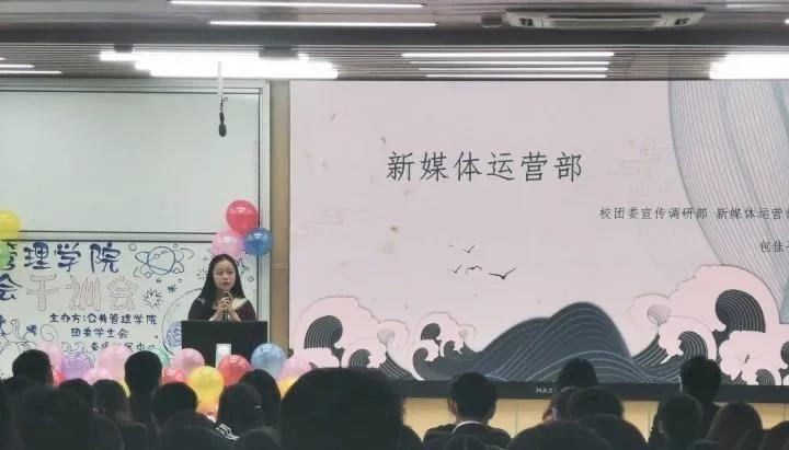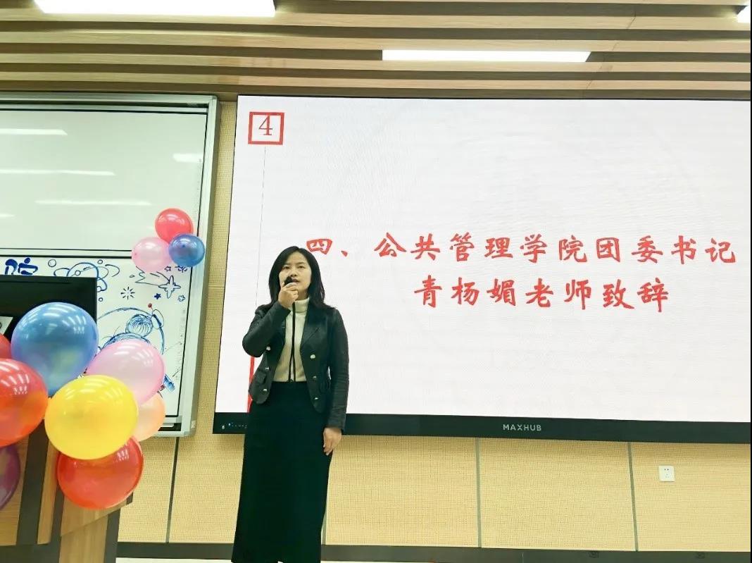 随后,青杨媚老师以“‘眼-口-手-心’——学院团学工作四部曲”为题进行了发言。青老师首先感谢同学们的拼搏和信任,使得公管团委学生会成为了一个传承优秀、追求卓越的集体。青老师进一步明确,要紧密围绕着提高同学们的学习能力、实践能力、创新能力来开展工作,需要做到“眼、口、手、心”四个层次的高度统一。所谓“眼”,是指具有发现问题的智慧之眼,时代发展趋势、党和国家的当前形势、学生需求的当前特点都要靠“眼”去发现;所谓“口”,是指目标计划的制定口径,包括年度目标、部门计划的安排传达,都需要用统一口径来传递;所谓“手”,是指落实工作的勤勉之手,工作的分解、工作的协调都需要用高效的手法来实现;所谓“心”,是指追求卓越、力争上游的奋进之心。