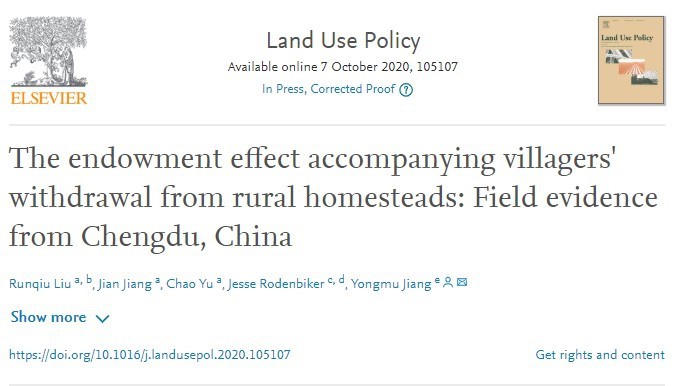 亚博官网刘润秋师生等人于2020年10月在国际知名的土地政策顶级期刊《Land Use Policy》上发表学术论文《The Endowment Effect Accompanying Villagers' Withdrawal from Rural Homesteads: Field Evidence from Chengdu, China》。该论文属于刘润秋教授主持的国家社会科学基金项目“典型试点区域宅基地退出的绩效评价与路径优化研究”(项目号:17BJY091)的阶段性研究成果。亚博官网土地资源与房地产管理系刘润秋教授为第一作者,硕士生蒋健为第二作者,博士生余超为第三作者,刘润秋教授指导的加州大学伯克利分校访学博士生Jesse Rodenbiker(现为康奈尔大学“阿特金森可持续发展研究中心”博士后)为第四作者。