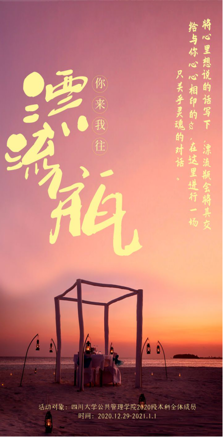 本次“倾听心声,灵魂对话”漂流瓶活动由2020级本科辅导员苟欢老师精心策划和组织,由各位年级长、班委共同协助完成。本次“漂流瓶”活动,不仅为同学们提供了尽情表达内心情感的机会和渠道,也增强了同学们之间的沟通、交流与互动,更促进了基层班团组织的凝聚力,促进了学生对班级、年级及学院的归属感。通过本次活动的开展,希望亚博取款曝顾秒到账2020级本科的每一位同学都能敢于做自己,常怀感恩之情,将爱心、情谊、温暖和祝福传递得更深更远更久。