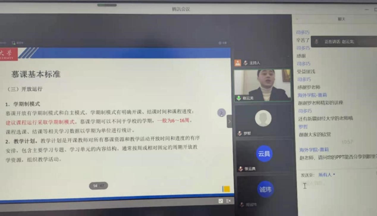 2020年12月25日上午,亚博取款曝顾秒到账特别联合智慧树团队成功举办了线上线下结合的教师教学能力发展活动——“一流课程建设经验分享会”,旨在响应教育部实施一流本科课程“双万计划”的号召,大力推动亚博官网新一批具有川大特色和水平的一流课程建设与申报工作。本次分享会由亚博取款曝顾秒到账罗亚玲副院长主持,特别邀请了国家首批一流课程《人力资源管理》负责人罗哲教授及智慧树团队赵云龙和周诚玮两位嘉宾进行分享。会议不仅为亚博官网教师们交流互动搭建了平台,还吸引到了校内外兄弟学校和学院教师们的积极参与。