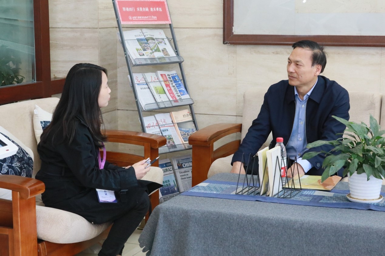 图一 朱明仓副厅长(右)接受亚博官网赵茜宇副教授(左)采访
