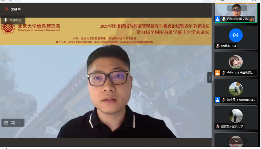 2021年9月25日至26日,由北京大学信息管理系、图情档39青年学者沙龙主办的2021年图书情报与档案管理研究生教育论坛暨青年学者论坛、第十四届全国图书馆学博士生论坛顺利召开。本次论坛采用线上为主、线上和线下结合的方式,来自全国高校、档案馆、图书馆等的数百名专家、学者参会,共同探讨图情档专业的人才教育、学科发展及前沿议题。秘书档案学系周文泓副教授应邀担任分会场“数字记忆与数字人文”主持人,2020、2021级档案学研究生代林序、张晓宇、2018级本科生贺谭涛应邀参会,并在“数字记忆与数字人文”、“图情档人才培养与学科发展”等分会场做主题发言。