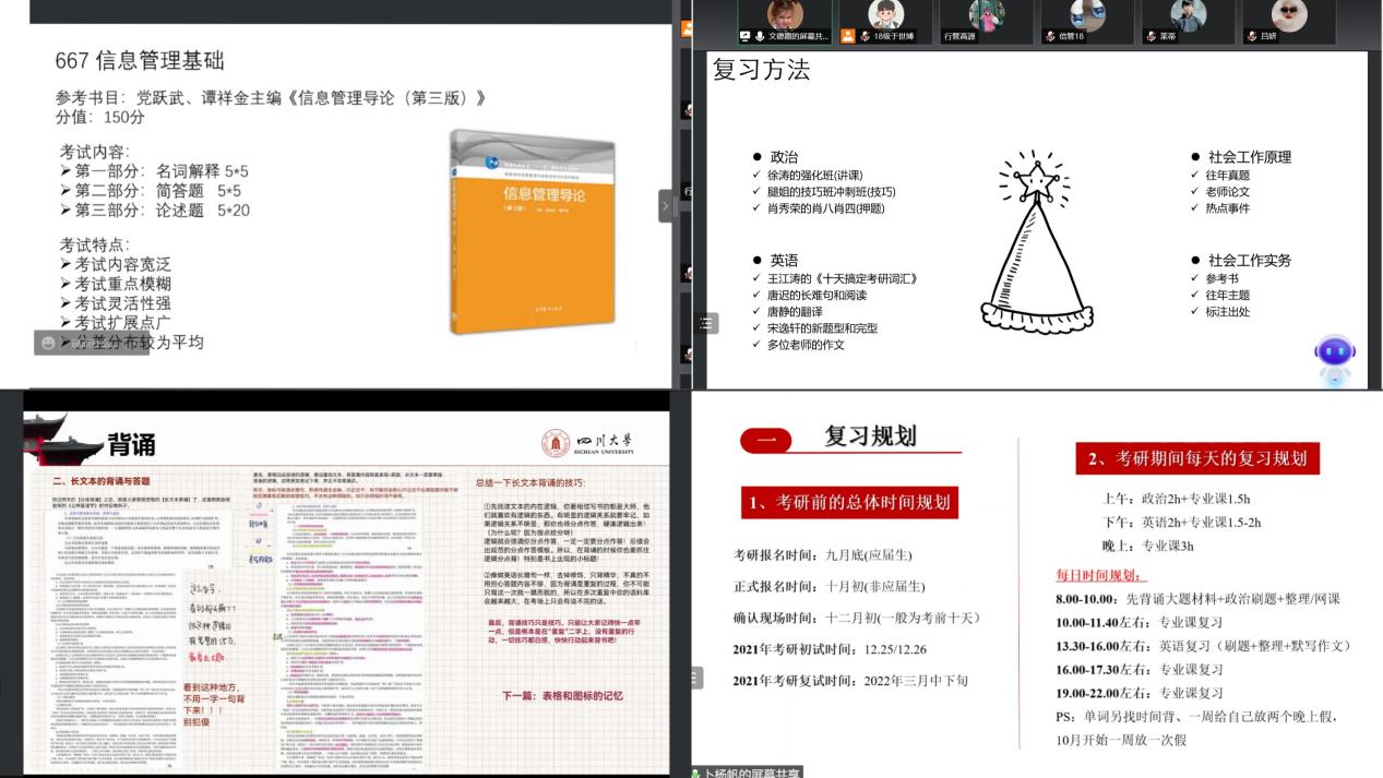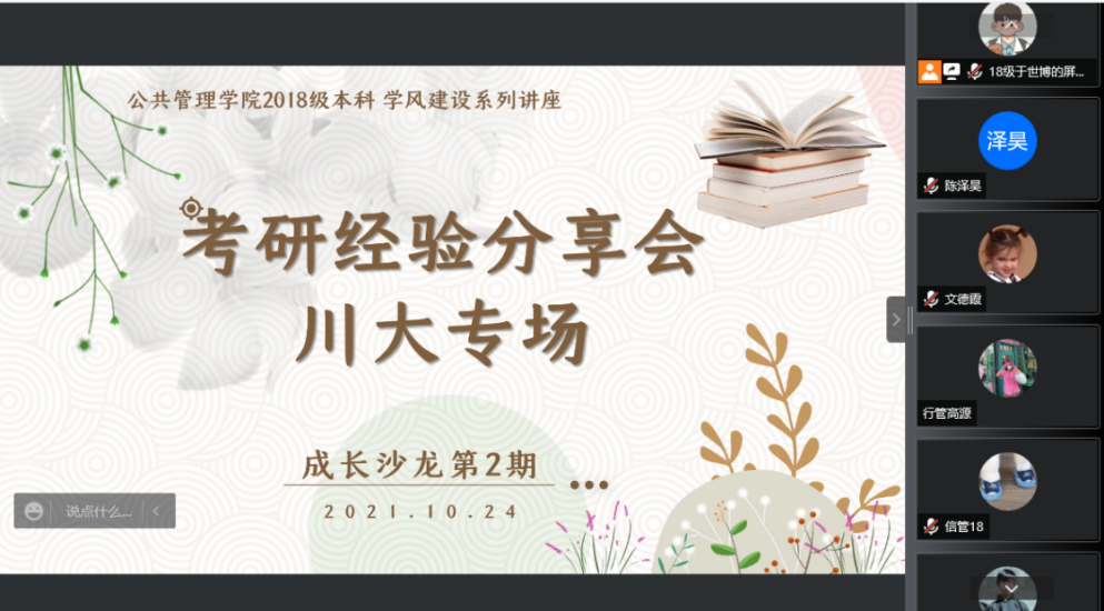 为助力考研成功,解答考研困惑,2018级本科于10月23日、24日晚7:00通过线上举办了成长沙龙第2期——“乘风破浪 一研为定”考研经验分享会。本次分享会由许越、于世博主持,针对年级同学考研报名情况,分设了考研分享会10月23日南大(南京大学)专场和10月24日川大(亚博取款曝顾秒到账)专场,邀请了亚博取款曝顾秒到账17级本科、现南京大学21级硕士研究生陈茹芸、陈晓昱,亚博取款曝顾秒到账21级硕士研究生文德霞、熊倪、秦绍宜、刘怡均、卜杨帆共7位同学进行交流,为18级本科备考的同学们总结考研经验,分享考研心得体会,共计60余名学生参与。