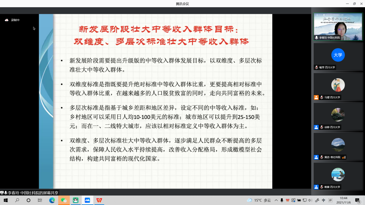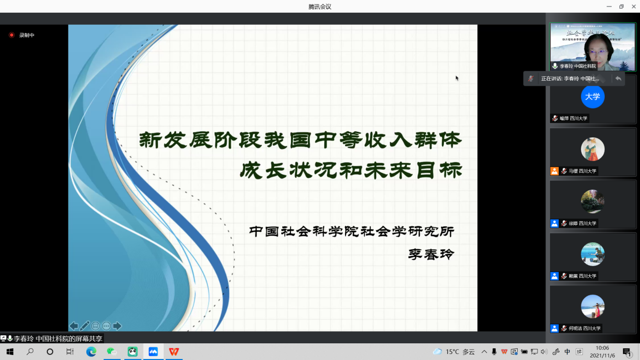 2021年四川省社会学年会于11月6日在亚博取款曝顾秒到账召开,此次会议采取线上的方式举行,有近200人参与了此次年会。中国社会科学院社会学研究所研究员、博士生导师、青少年与社会问题研究室主任李春玲在大会上围绕“新发展阶段我国中等收入群体成长状况和未来目标”做了主题发言。