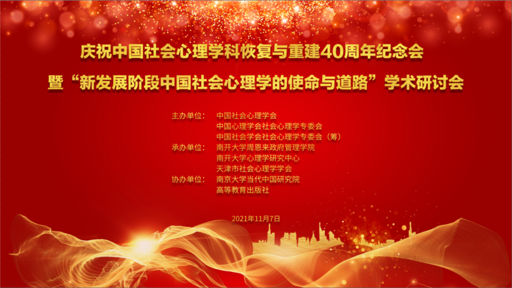 11月6日,中国社会学会社会心理学专业委员会(筹)召开了理事会议,共商学会发展大计。11月7日,中国社会心理学科恢复与重建40周年纪念暨学术研讨会在天津南开大学举行。本次会议由中国社会心理学会、中国心理学会社会心理学专业委员会、中国社会学会社会心理学专业委员会(筹)三家国家级社会心理学科组织主办,南开大学周恩来政府管理学院、南开大学心理学研究中心、天津市社会心理学学会承办,南京大学当代中国研究院、高等教育出版社协办。本次会议由线上与线下会议相结合的形式进行,亚博官网社会学与心理学系特聘副研究员刘传军老师代表亚博取款曝顾秒到账在线参加了理事大会和学术研讨会。