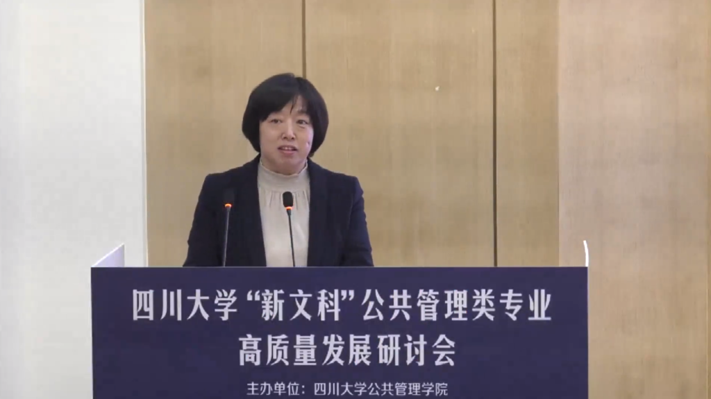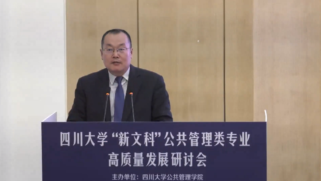 教育部公共管理类教学指导委员会秘书长、浙江工商大学校长郁建兴教授在致辞中,从产业革命对人才需求、对高等教育的交互影响出发,指出数字时代对我们的高等教育、高等教育的专业建设,以及学科建设、学术体系等等,都提出了前所未有的要求。郁建兴教授指出新文科的新本质在于创新。新文科的高度体现在要求学科体系、学术体系、话语体系都要具有中国气派和中国智慧。新文科的硬度则体现推进各个专业和理工医等学科的交叉融合。而新文科的黏度则指新文科需要服务、建设甚至引领经济社会发展。新文科还需要具有广度,需要在更加广泛的范围内,结合各级党委、政府来开展。郁建兴教授指出川大作为我国公共管理学科的西部重镇,能够勇担使命,专门开会研讨新文科公共管理类的专业建设,堪称领风气之先。