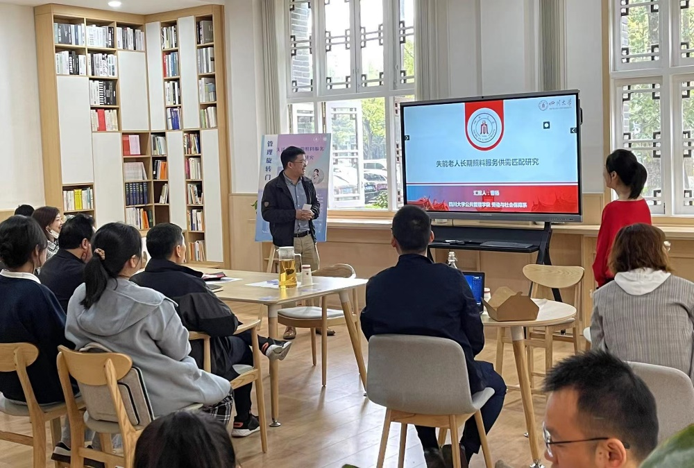 分享会伊始,主持人劳动与社会保障系的林熙老师简要介绍了曹杨老师的研究方向与学术传承。曹杨老师主要从事人口老龄化、健康养老服务与社会保障等方面的教学与研究工作。近四年,曹杨老师深耕于长期照料领域,并形成了一系列阶段性成果。借助此次学术沙龙的机会,曹杨老师为大家进行了题为“失能老人长期照料服务供需匹配”的系列研究成果分享。首先,曹老师的研究揭示了长期照料服务供需失衡对健康老龄化的负面效应;在这种负面效应被普遍性认知的基础上,曹老师进一步考察了目前我国长期照料服务供需失衡的现状及其风险因素,并最终提出长期照料服务供需匹配的机制与实现路径。