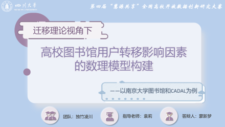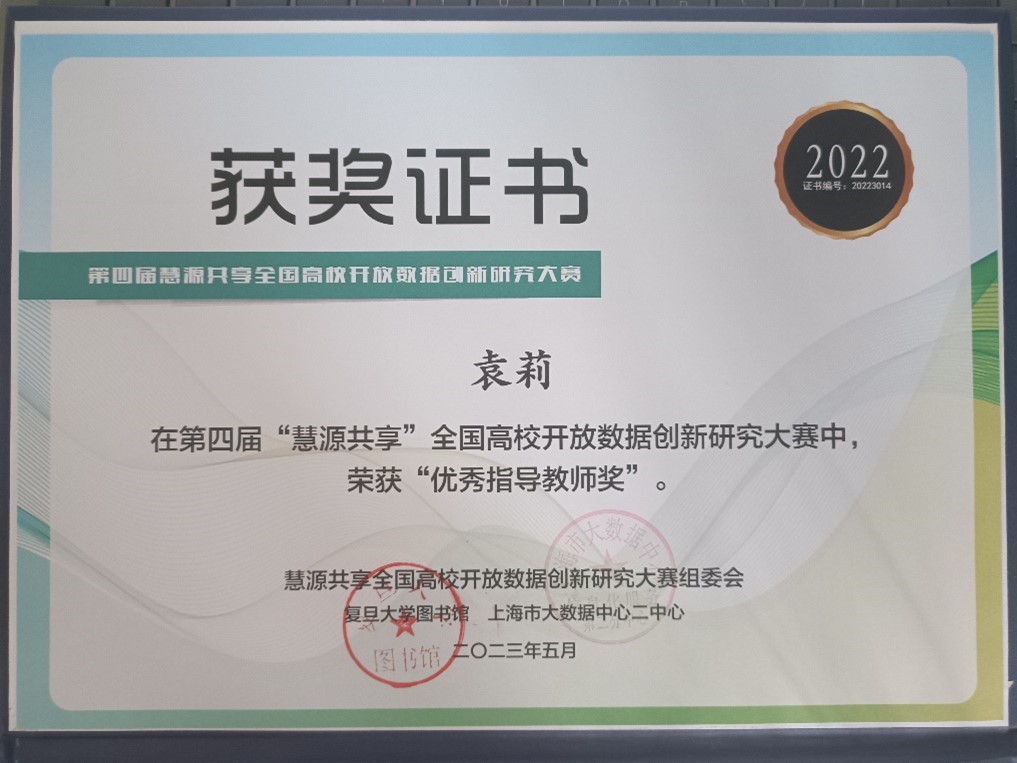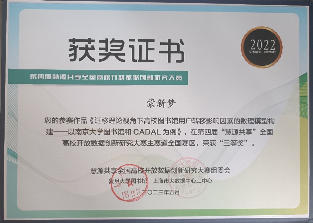 在袁莉老师的悉心指导下,亚博官网信息资源管理专业2021级本科生蒙新梦同学的“独竹凌川”团队,以《迁移理论视角下高校图书馆用户转移影响因素的数理模型构建——以南京大学图书馆和CADAL为例》为题,探究高校图书馆用户由传统图书馆向数字图书馆转移的影响因素,为高校图书馆的发展探寻新方向,最后经过激烈答辩,荣获“三等奖”,袁莉老师获得“优秀指导教师奖”。