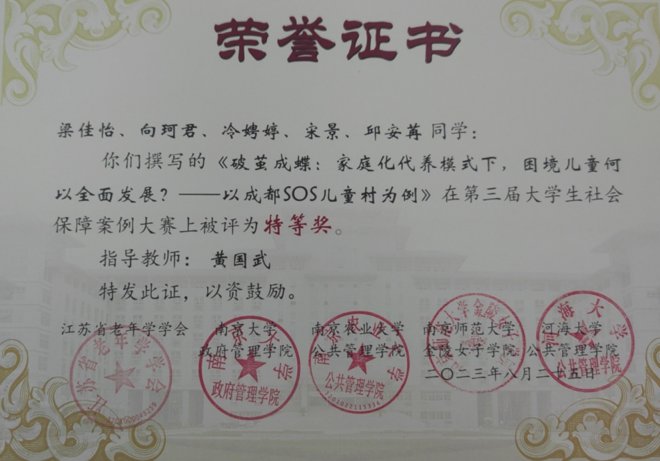 在亚博官网劳动与社会保障系黄国武老师的指导下,2020级行政管理专业本科生梁佳怡、2021级行政管理专业本科生邱安苒、2021级劳动与社会保障专业本科生向珂君、冷娉婷、宋景五位同学组成参赛团队,通过前期讨论选题、克服实地调研的种种困难等,于七月底共同完成案例分析报告《破茧成蝶:家庭化代养模式下,困境儿童何以全面发展?——以成都SOS儿童村为例》,经过初赛专家评审,团队最终进入决赛,通过案例展示、现场答辩等突出表现,一举斩获全国特等奖,充分展现了川大亚博取款曝顾秒到账学子“公成天下、管法自然”的浓厚情怀和扎实的学科素养。
