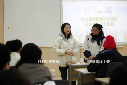 明诚项目主管杨雪梅从儿童友好政策背景、聚焦“五大友好”探索儿童友好建设路径、儿童观察团推动儿童友好的社区实践案例和儿童友好社会工作实务成效四个方面展示明诚特色项目的发展,理事长何利明从自身学习与工作经历为同学答疑解惑。