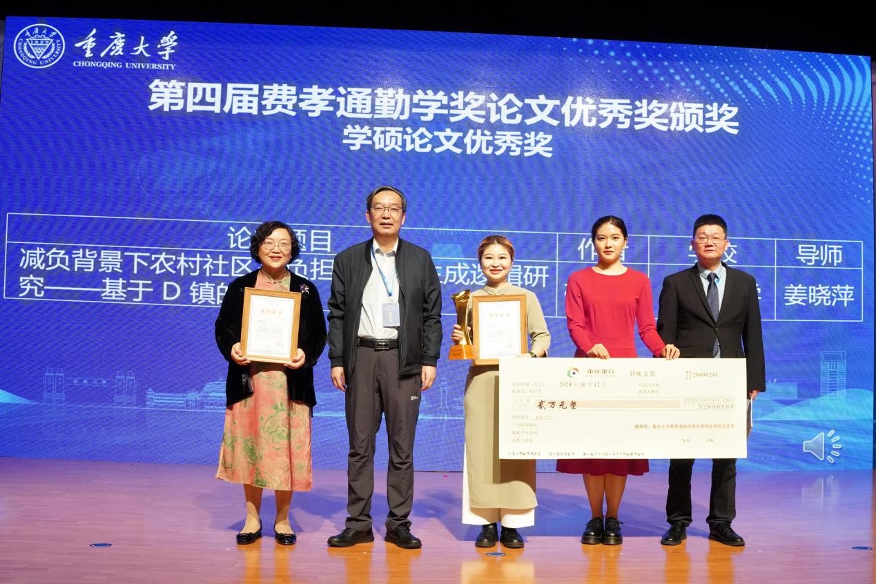 10月12日,第四届“费孝通勤学奖”颁奖典礼在重庆大学举行。继亚博官网2020届硕士白浩然同学获得第三届“费孝通勤学奖”唯一优秀硕士学位论文奖(指导教师李晓梅)以来,杨舒雯、史军、郑冰鑫3位同学在本届评选中再创佳绩。