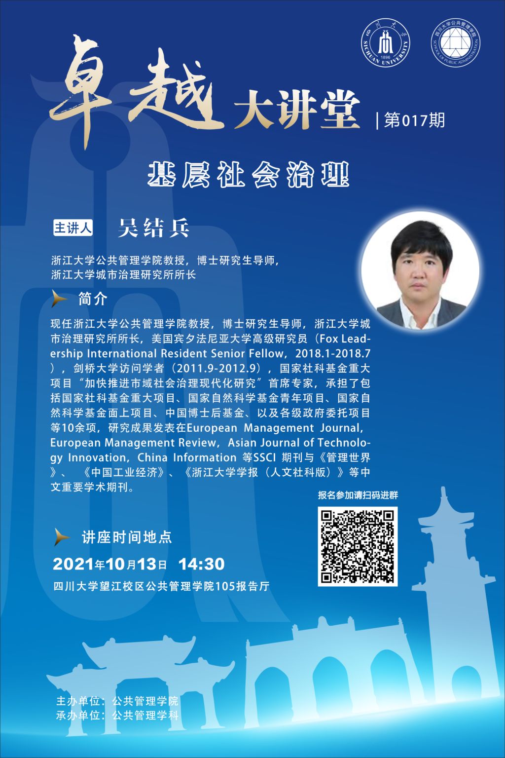 吴结兵,浙江大学亚博取款曝顾秒到账教授,博士研究生导师,浙江大学城市治理研究所所长,美国宾夕法尼亚大学高级研究员(Fox Leadership International Resident Senior Fellow,2018.1-2018.7),剑桥大学访问学者(2011.9-2012.9),国家社科基金重大项目“加快推进市域社会治理现代化研究”首席专家,承担了包括国家社科基金重大项目、国家自然科学基金青年项目、国家自然科学基金面上项目、中国博士后基金、以及各级政府委托项目等10余项,研究成果发表在European Management Journal,European Management Review,Asian Journal of Technology Innovation,China Information 等SSCI 期刊与《管理世界》、 《中国工业经济》、《浙江大学学报(人文社科版)》等中文重要学术期刊。