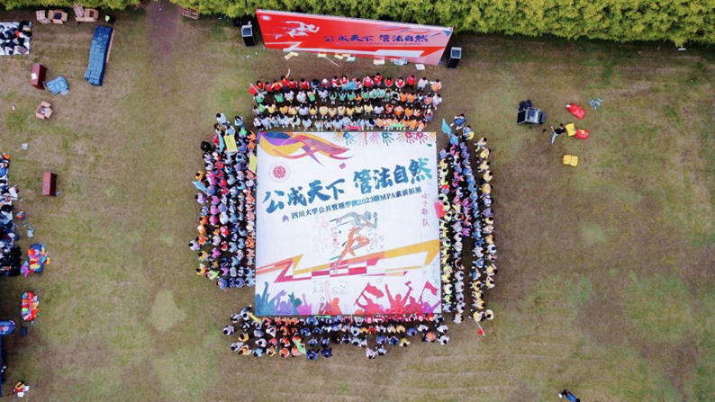 一声令响,比赛正式开始。“击鼓颠球”、“千里传球”,各组成员胆大心细,通力合作,呐喊声一浪赛过一浪。午餐后的“旱地龙舟”掀开了本次团建活动的高潮,哨声划过长空,各队如脱缰的马儿奔向目的地,队员们齐心协力、奋力争先。活动最后,全体同学共同绘制了“公成天下,管法自然”的巨幅彩绘。