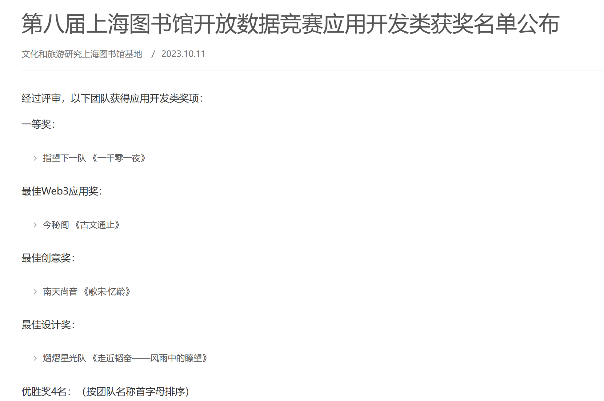 10月8日,第八届上海图书馆开放数据竞赛应用开发类决赛答辩于上海图书馆举行。此次比赛由上海市经济和信息化委员会、上海市文化和旅游局指导,由上海图书馆(上海科学技术情报研究所)、国际科学技术信息理事会(ICSTI)、上海市中心图书馆主办,与CADAL项目管理中心、中国历代人物传记资料库项目(CBDB)、复旦大学图书馆等多家单位进行合作。本届大赛以“链汇古今,AI赋人文”为主题,面向全球征集优秀移动应用原型、创意及算法。上海图书馆开放数据竞赛自2016年起已成功举办7届,被列入亚博取款曝顾秒到账信息资源管理专业竞赛名单。大赛共吸引来自28个省市、国内外的一百多支队伍参赛,参赛选手涵盖了高校学生、企业团队、政府人员。本届大赛共设有应用开发类赛道、创意论文类赛道和算法类赛道,其中应用开发类赛道设一等奖1名、最佳Web3应用奖1名、最佳创意奖1名、最佳设计奖1名和优胜奖4名。