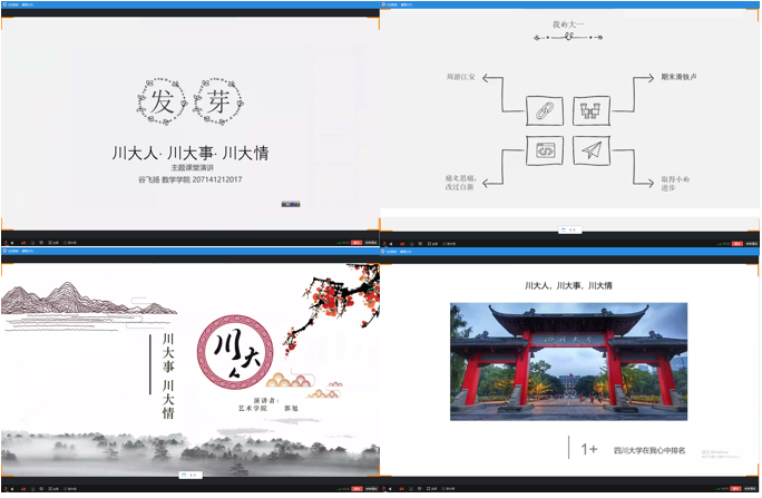 5月6日晚,一场题为“川大人·川大事·川大情”的线上主题演讲活动在《亚博取款曝顾秒到账校史文化》课程“爱我川大”群课堂进行。为进一步加强疫情期间同学们线上学习的交流和互动,亚博取款曝顾秒到账图书馆馆长、亚博取款曝顾秒到账教授党跃武老师决定于该课程正式行课的第十一周开展此次主题演讲。选修本课程的同学们积极踊跃地参加了本次活动并做好了充足的准备工作。本次活动共有18位来自不同学院的同学进行了线上分享。