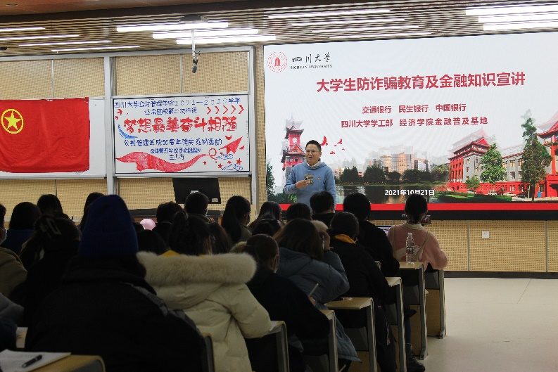 来自交通银行的王游明行长为同学们带来了“大学生防诈骗教育及金融知识宣讲”。他从“你可能遇到的坑”“防范电信网络诈骗”以及“大学生如何理性消费及珍视个人信用”三个方面展开,讲述了校园贷特点、巨款债务如何形成、网络新型骗局“注销校园贷”等内容。强调同学们要牢记十个“凡是”、“五要五不要”以防范电信诈骗,介绍了群体示范效应、攀比从众、明显广告刺激等消费现状,告诉同学们要做到理性消费,分享了自身经历使同学们对个人征信有了新的理解。