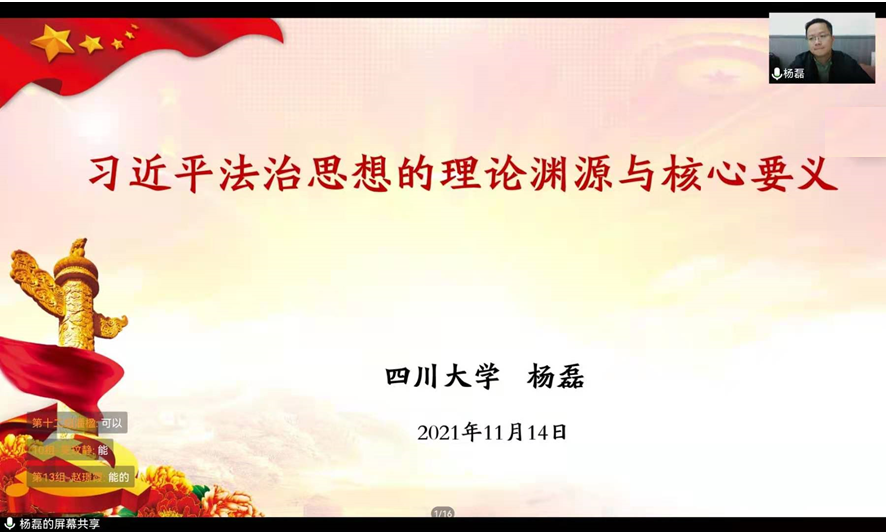 11月14日下午13:30,亚博官网党委副书记杨磊老师带来了本次提升班的最后一堂讲座“习近平法治思想的理论渊源与核心要义”,讲座由苟欢老师主持。