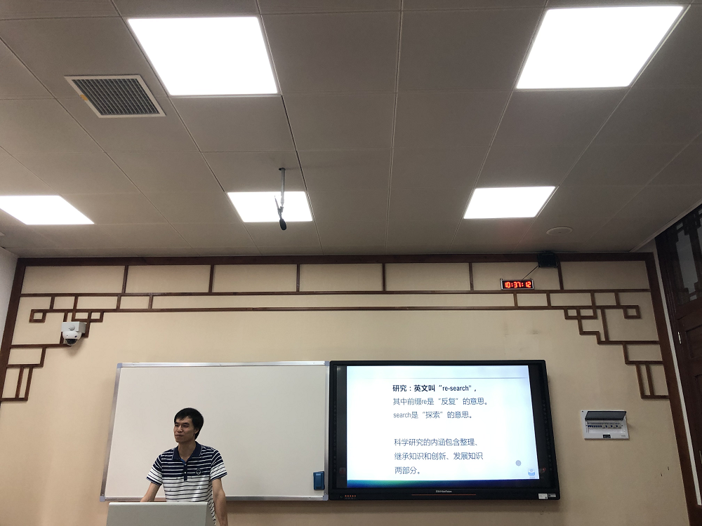 第二部分唐鹏老师以“科研为何”为主题进行了讲解。唐鹏老师以几句关于科研的幽默句子来进行引入,让同学们对科研有了一个初步的认识。之后通过我国与国外对于科研的定义进行了深入的讲解,强调科研其实就是一种反复探索、整理,继承与创新知识的过程。在最后唐鹏老师用三个层次来界定科研,科研是一项工作、是一项事业、更是一种生活方式。鼓励有意向继续深造的同学们把握好机会,同时也要懂得增添自己的生活趣味。