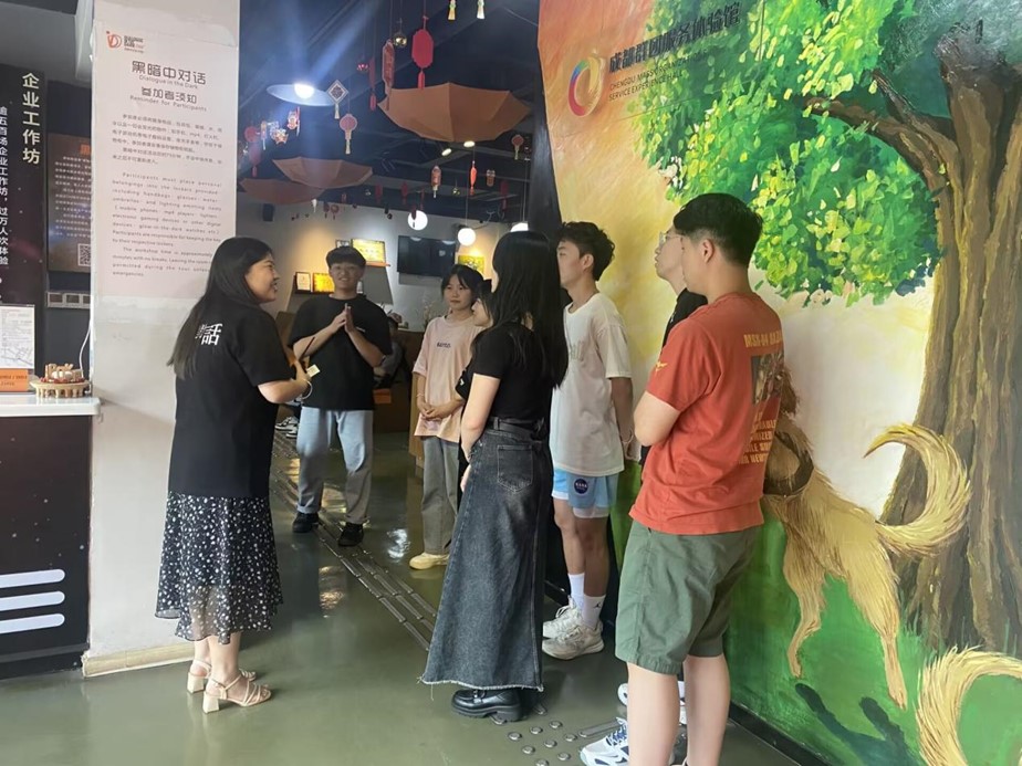 活动开始,同学们手持盲杖,在导赏员的引导下分组进入场地实践。没有了视觉的支撑,就只能凭借听觉和触觉判断自己身处何地,带给大家强烈的身心冲击。同学们齐心协力探索了景区、闹市、超市和餐厅等多种生活场景,深感视觉障碍人群日常生活不易。