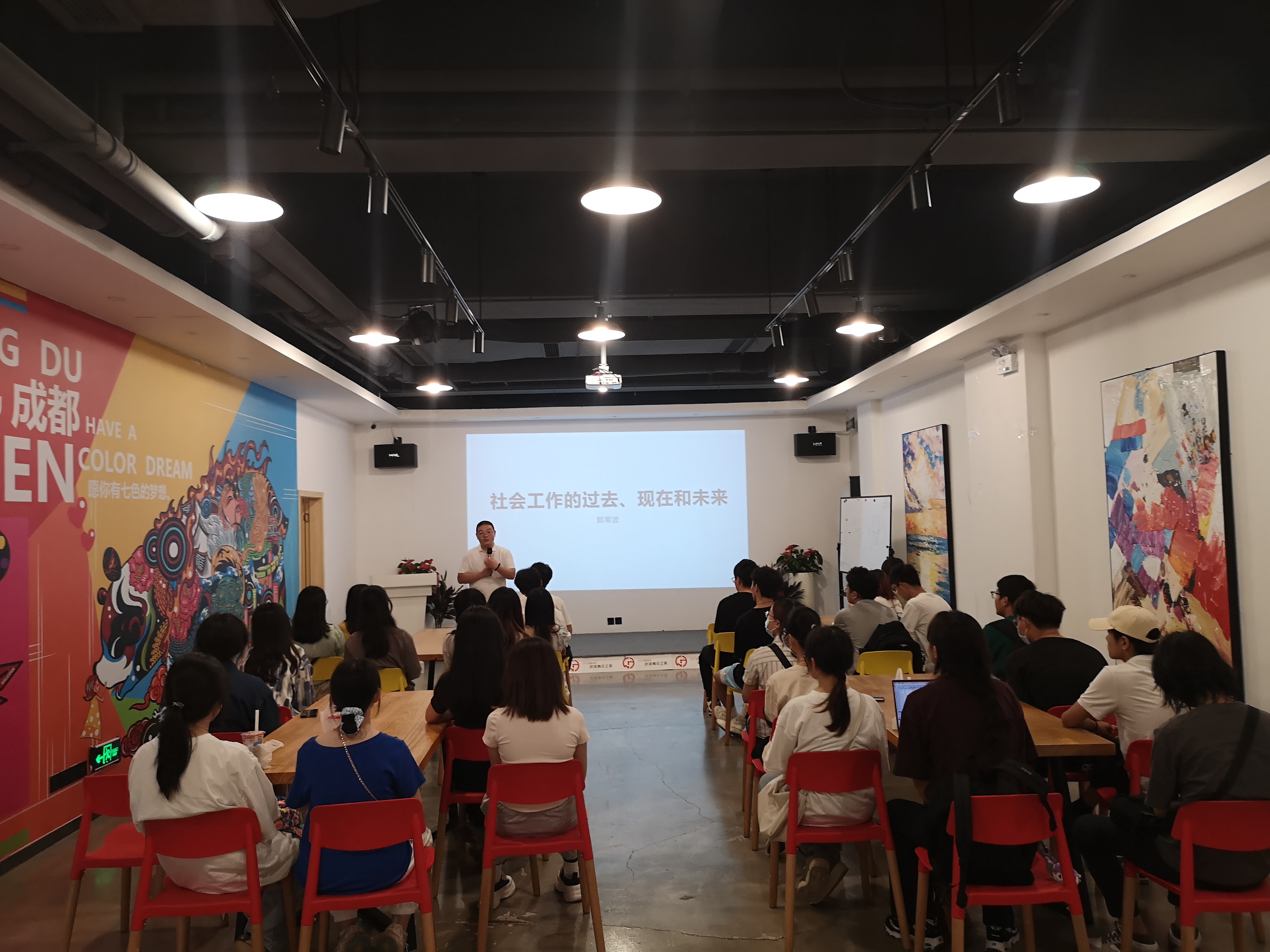 为了使同学们在课堂外进一步了解专业社区工作的产生和发展过程,深度剖析社会工作行业发展过程中形成的社会困境及其解决之道,增加《社会心理学》关于社会困境有关知识的感性体验,亚博官网2022级社会工作本科生在刘传军老师的带领下,于6月8日下午来到成都市武侯区青年之家、武侯区聚落青年服务中心,进行《社会心理学》课程实践教学活动。武侯区聚落青年服务中心负责人、实务授课郭常波老师为本次实践交流做了精心准备,以“社会工作的过去、现在和未来”为题交流了他对整个行业发展的观察和体会,以“从我的历程回观社工机构的异化”为题交流了他关于行业和机构发展困境及其破解之道的见解。